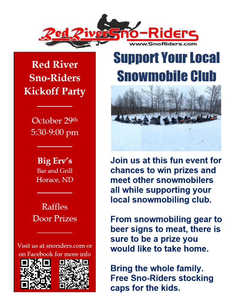 The club will be holding our Annual Kickoff Party Friday, Oct 29th from 5:30-9pm at Big Erv’s in Horace. This event is a great way to support for your local snowmobile club who’s volunteers create and maintain the local snowmobile trail. Hope to see you there.